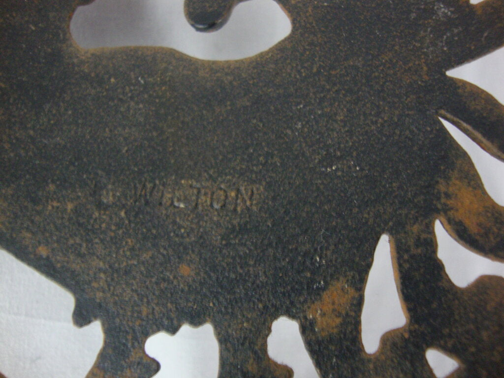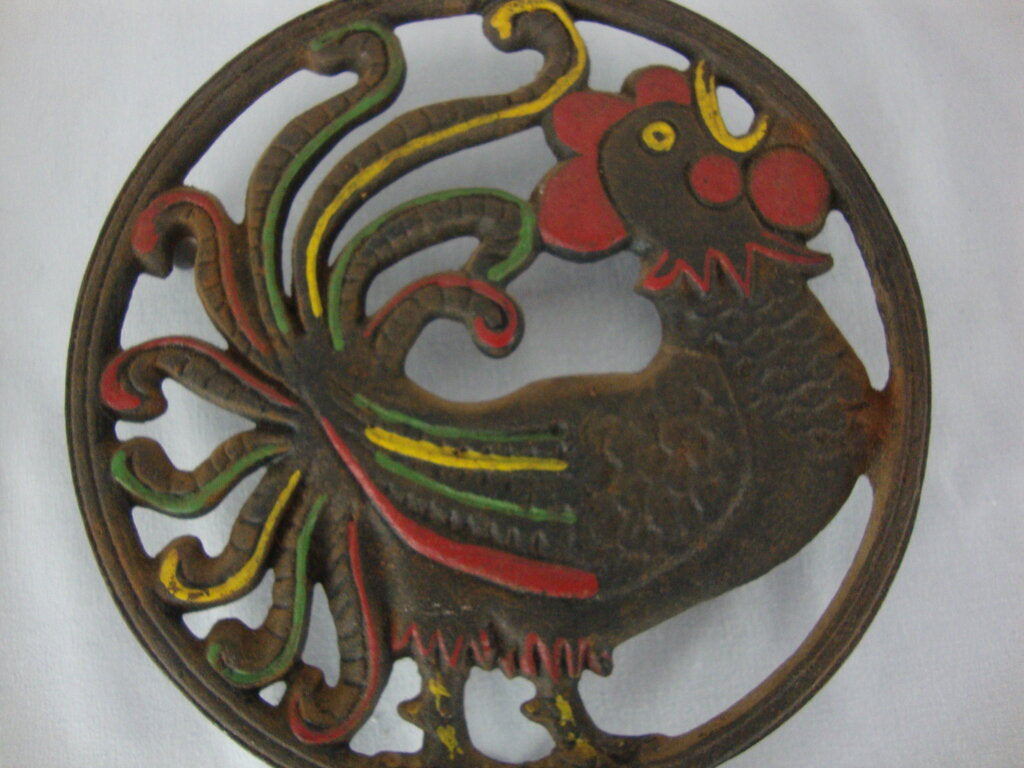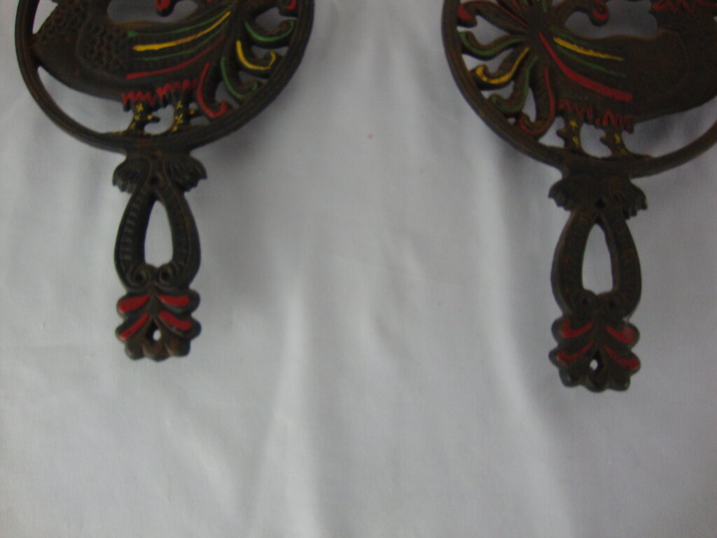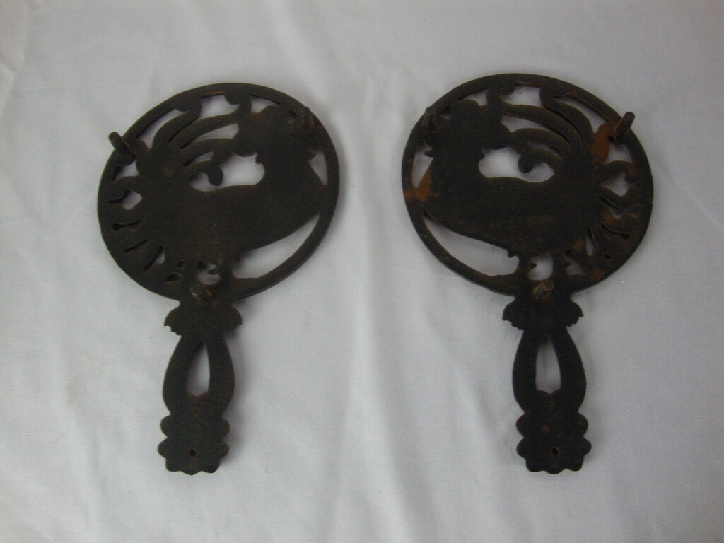 Farmhouse adorable vintage Wilton cast iron wall or counter trivet pair with crowing roosters opposing. Set has wear/tear, finish loss, rust and measures about 1/2" height by 5 1/4" diameter trivet by 9" total length. If you choose to arrange to have an item shipped please make sure to insure the shipment as we are not responsible for damage that occurs in shipping. All items are sold “As Is” and all sales are final. Most pieces are one of a kind and can not be replaced. We will give you as much information as possible regarding the pieces condition including supplying additional pictures if needed. Due to the nature of antique and vintage items there may be blemishes, nicks or other imperfections as expected with age and use. If you want more information about an item, such as additional images or condition, please inquire! All items are located in our store at Standpipe Antiques, 502 O Neal Street, Belton, SC, 29627. Our hours are Wednesday through Friday 10am to 6pm, Saturday 10am to 5pm and Sundays 12-5pm. Come by and see us!